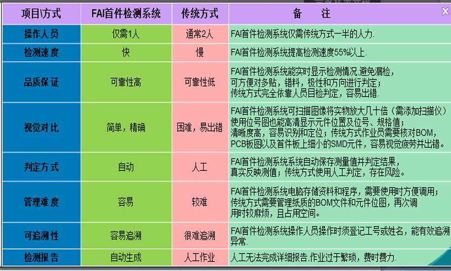 隨著電子產(chǎn)業(yè)的蓬勃發(fā)展,今天,中國已經(jīng)成為世界的工廠。電子制造企業(yè)的生產(chǎn)效率,品質(zhì)控制和成本高低決定著企業(yè)的競爭力,也決定著企業(yè)贏得客戶訂單的能力。電子產(chǎn)品的高度集成化,貼片元件的尺寸及PCBA板的密度達到了前所未有的程度,產(chǎn)品更新?lián)Q代的速度也越來越快,多機種,小批量,頻繁換線越來越挑戰(zhàn)工廠的制造能力。高速貼片機等設(shè)備提升了工廠的生產(chǎn)能力,但是在SMT首件確認(rèn)環(huán)節(jié),大多數(shù)工廠卻依然停留在非常落后的人工確認(rèn)階段。首件確認(rèn)已經(jīng)成為SMT生產(chǎn)的瓶頸!目前SMT首件確認(rèn)通常為兩個作業(yè)員配合操作,人工對照紙質(zhì)BOM清單,CAD位置圖和首件板,同時還要進行元件的量測,誤差計算、對錯判斷和記錄等工作。整個過程耗時較長,導(dǎo)致貼片機使用效率降低,甚至造成停線等待。首件確認(rèn)環(huán)節(jié)也過多地占用了人力成本,導(dǎo)致工廠成本上升。另外人工確認(rèn)缺乏有效的管控,不可避免的人為失誤加大了首件檢測的風(fēng)險,可能造成產(chǎn)品批量返工。針對此難題,深圳華普通用科技有限公司聯(lián)合美國陽升測試設(shè)備有限公司,成功推出了SMT智能首件檢測系統(tǒng)FAI-520,在實現(xiàn)品質(zhì)提升的同時,還可以減少一半人員,提高一倍效率!